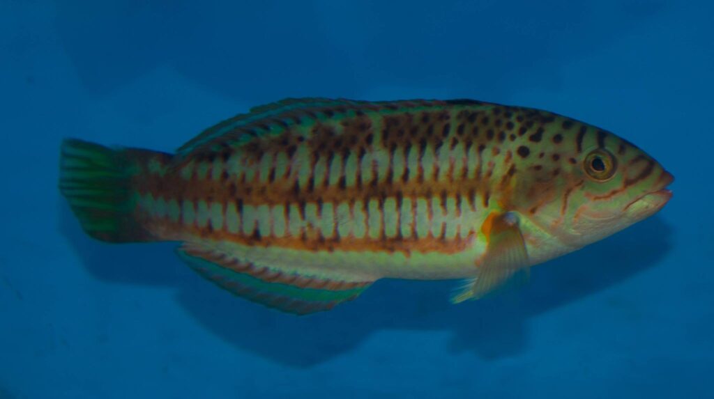 - Appearance: The moon wrasse has a striking appearance with a predominantly greenish body that may have a bluish or purplish hue, especially towards the head and upper body. It often has a darker band running horizontally along its sides. Juveniles and females have a more subdued coloration compared to males, which display more vibrant colors.