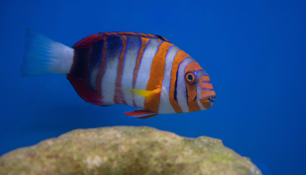 The harlequin tuskfish (Choerodon fasciatus) is a stunning, vividly colored species found in the Indo-Pacific region, particularly around Australia and the Philippines. Known for its striking electric blue, orange, and white bands, this fish is especially popular in saltwater aquariums. Its bright blue teeth are another distinguishing feature, giving it the name "tuskfish."